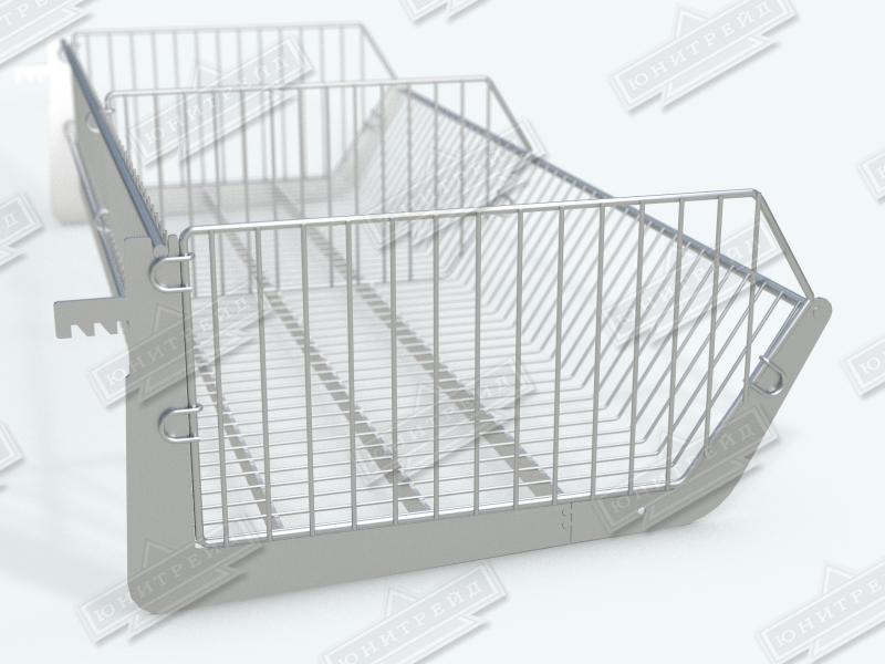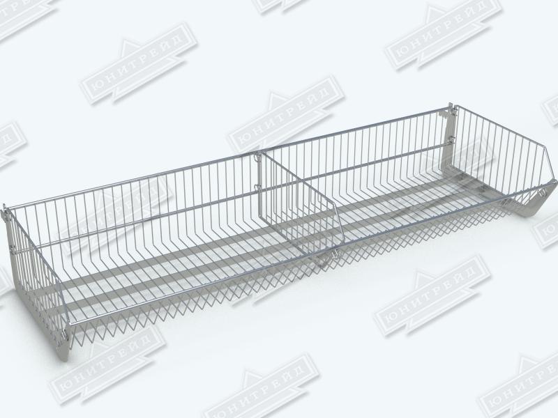 1 длинный стеллаж с продукцией. Данный тип корзин используют для выкладки товаров в магазинах продуктов и одежы. За счет жесткого пластинчатого каркаса (состоит из полос, на которые крепятся корзины) выдерживает больший вес.