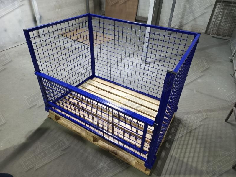 Не штабелируемое паллетное ограждение 1209х800х890мм изготовлено из профильной трубы 20х20х1.5 и вваренной сетки с ячейкой 108х50мм и диаметром проволоки 5 мм.
