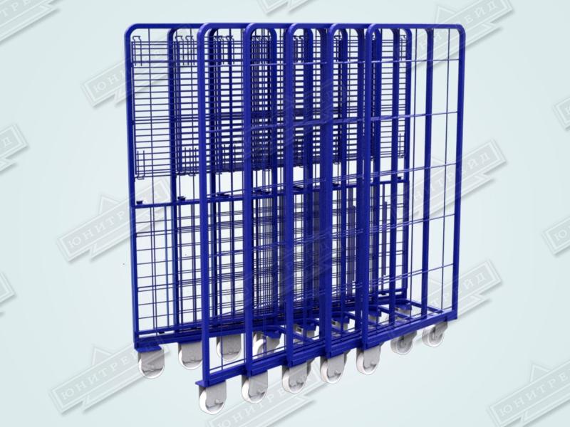 Контейнер на колёсах предназначен для хранения и транспортировки грузов как в нутри торгового предприятия или склада, так и для перевозки товаров транспортными компаниями. Контейнер данного типа используется в качестве многоразовой оборотной тары и благодаря своему конструктиву удобен для транспортировки в не загруженом виде без необходимости полной разборки, что позволяет существенно сэкономить время и рабочую площадь компании перевозчика.