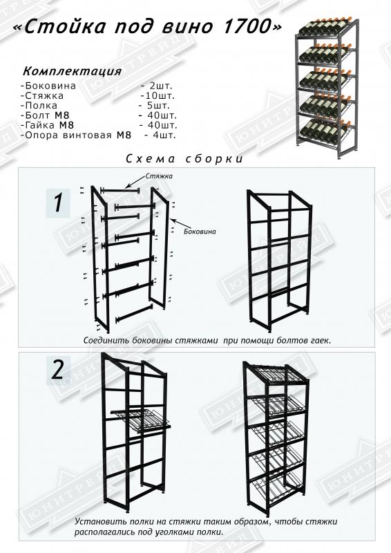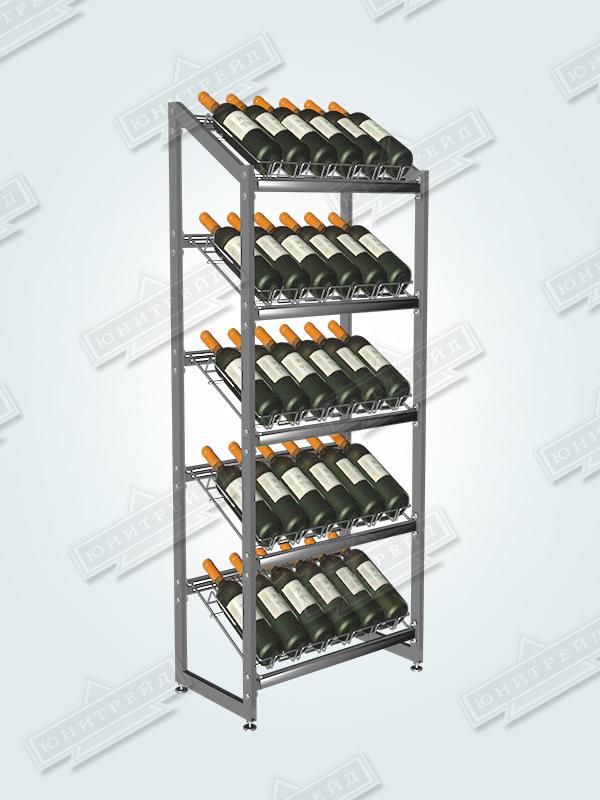 Стойка для выкладки бутылок вина. Металлические полки позволяют надёжно расположить бутылки с винной продукцией, исключая не желательное задевание тары, при реализации в залах с высокой проходимостью. Обеспечивает отличный обзор продукции для покупателя.